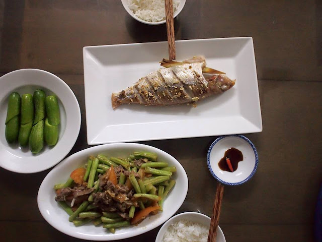 Cá đổng nướng muối xã ớt, đậu que xào thịt bò và dưa leo baby